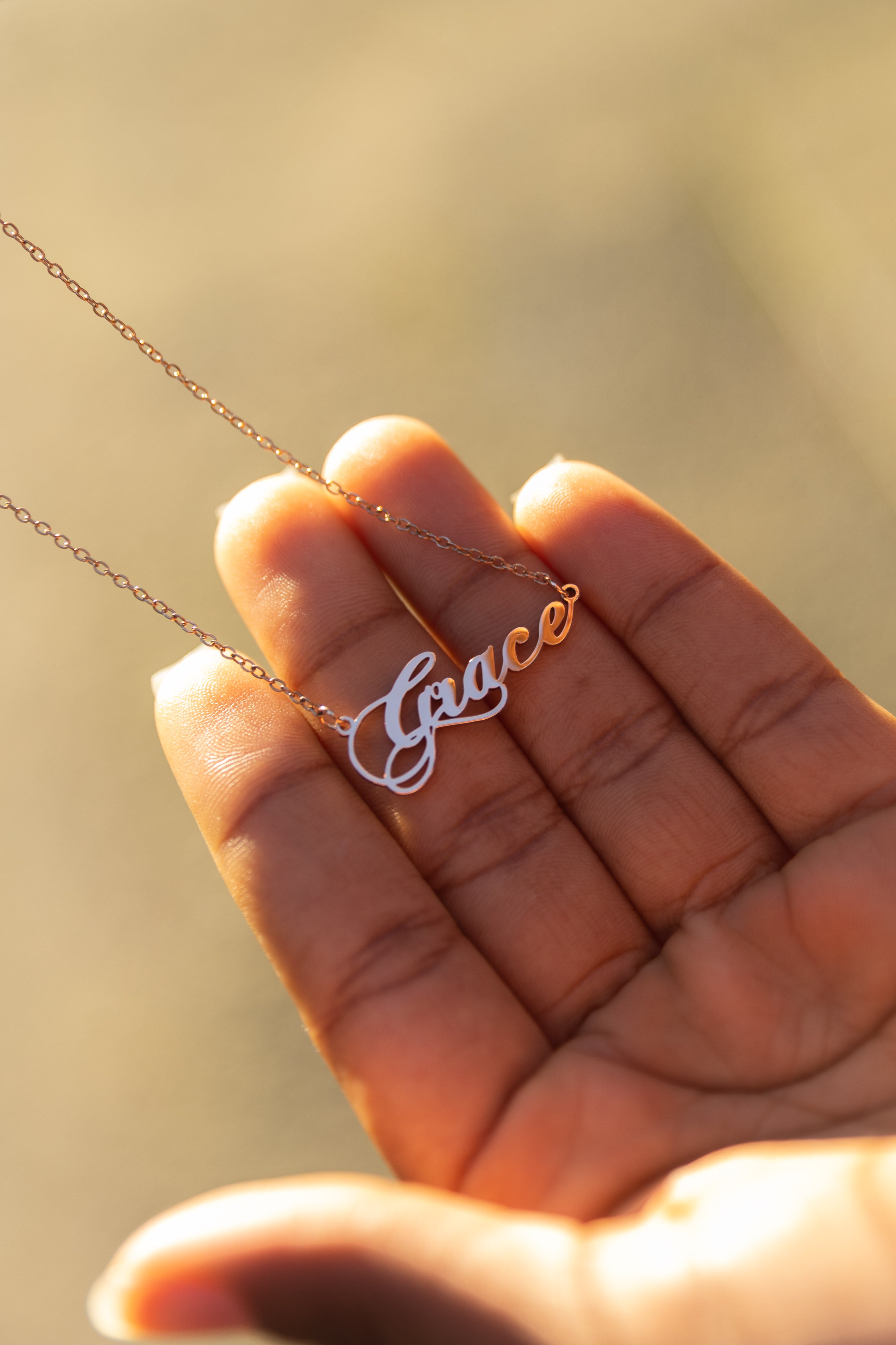 The way that the name sits perfectly centred is super clean and well thought out. The rose gold/gold chain is thin but not flimsy, so it gives that classy, luxury look and feel. And the stainless steel reflects light beautifully